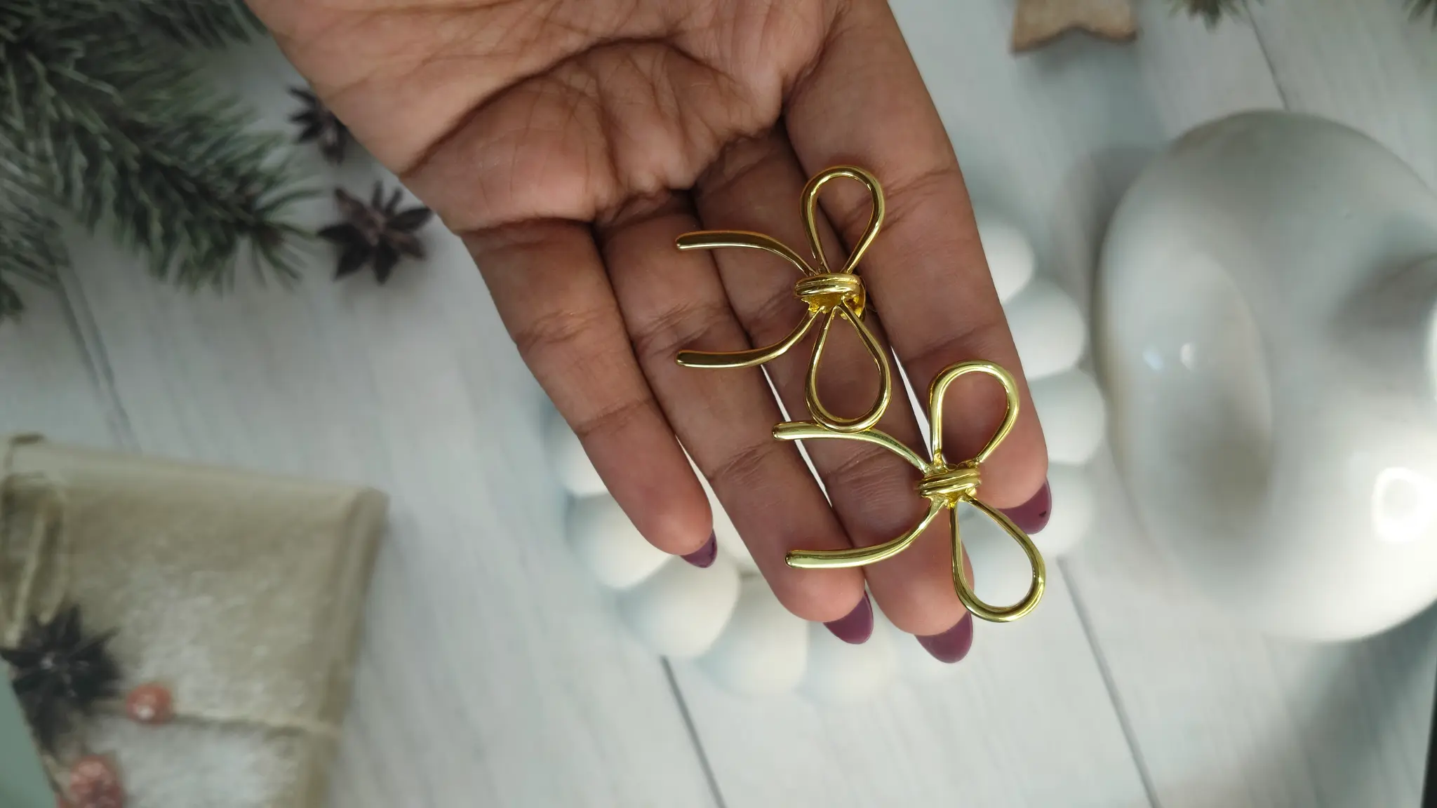 Delicately bold and effortlessly chic, these anti tarnish statement studs are crafted to elevate your festive and evening looks. With a modern bow-inspired silhouette and rich gold finish, they double as refined party wear earrings that pair beautifully with sleek anti tarnish hoops for a layered, luxe style moment.