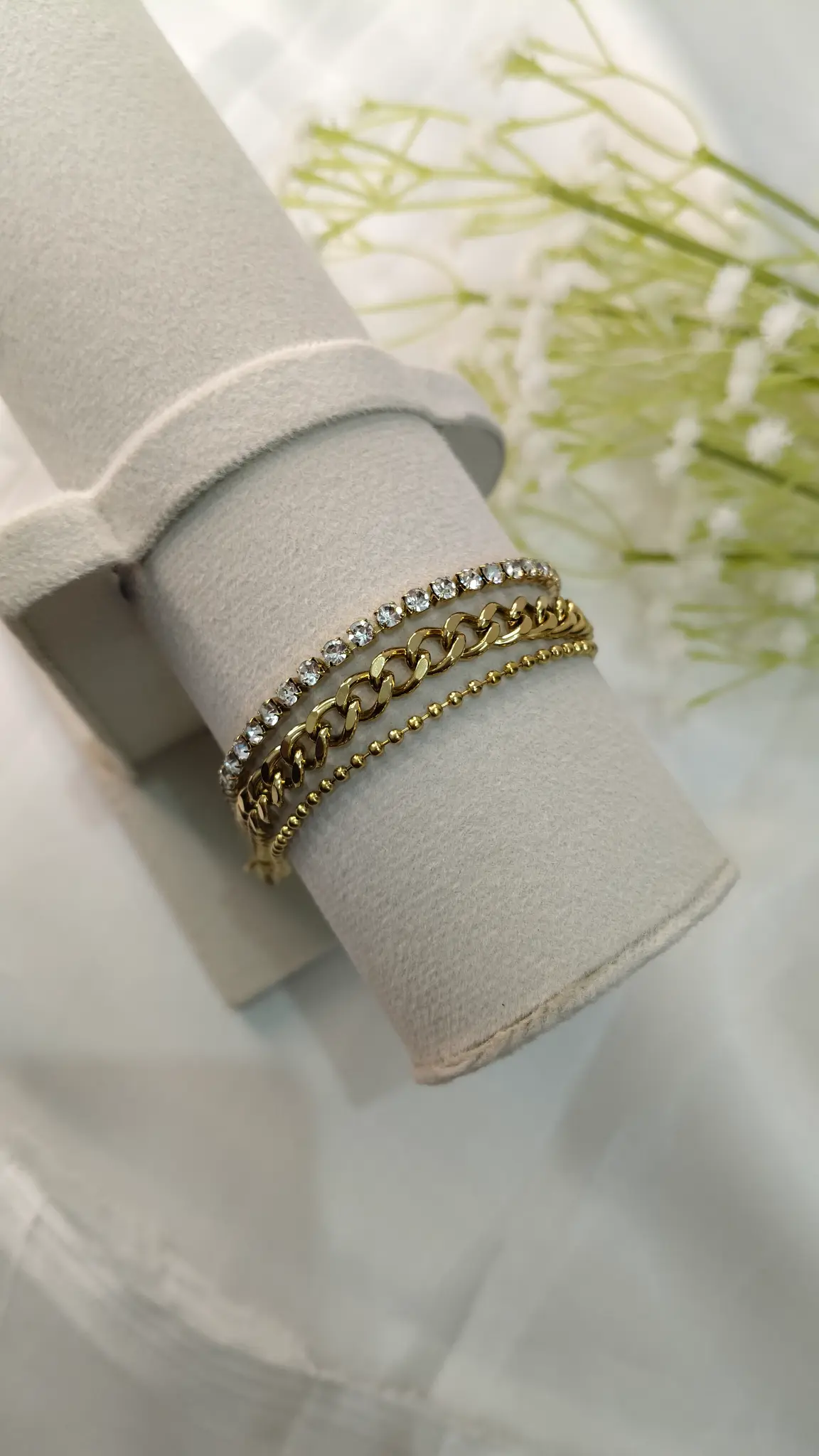 Make a bold yet elegant statement with this stunning Anti Tarnish Chain Bracelet. Designed with a perfect blend of sparkling stone detailing, classic gold chain links, and delicate bead accents, this layered bracelet offers a trendy stacked look in one refined piece.