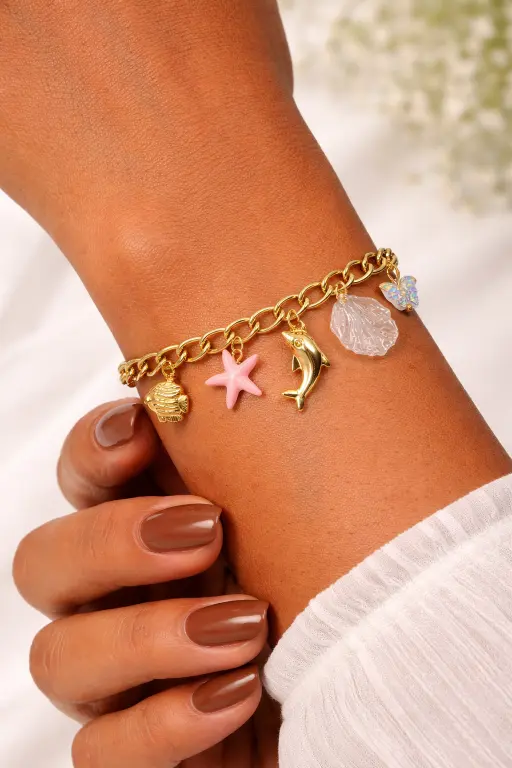 Add playful elegance to your look with this stunning party wear chain bracelet, designed with beautiful ocean-inspired charms. Featuring delicate details like a starfish, shell, dolphin, butterfly, and textured gold accents, this bracelet perfectly captures the essence of fun and femininity.