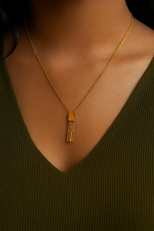 For a minimal everyday look, wear the geometric charm necklace solo with a crisp shirt or silk blouse.