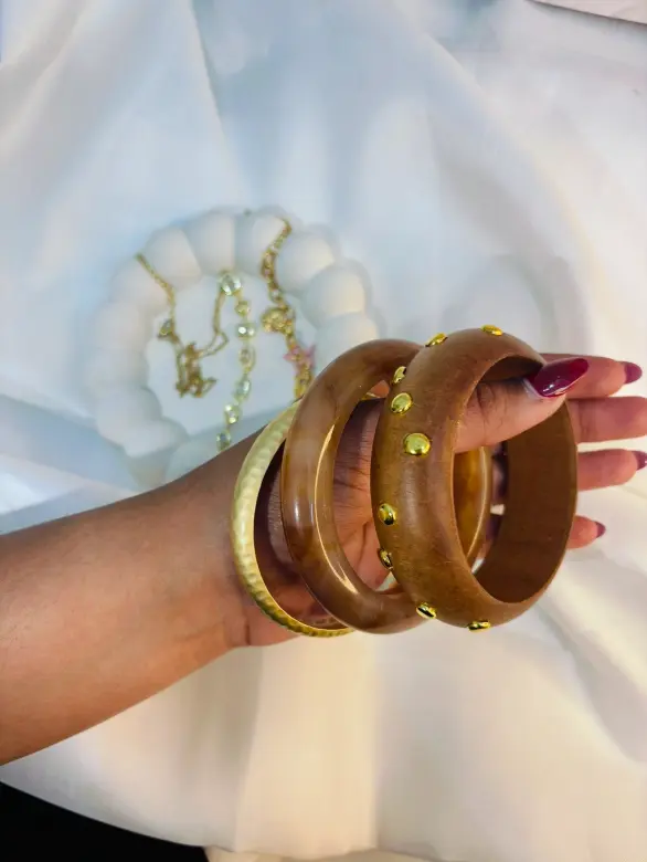 Introducing our Desert Gold Luxe Statement Stackable Bracelets — a refined trio inspired by warm sunset tones and rich natural textures. Featuring a hammered gold bangle, a glossy caramel resin band, and a deep wooden base adorned with delicate gold studs, this stack is designed to make a bold yet sophisticated statement.