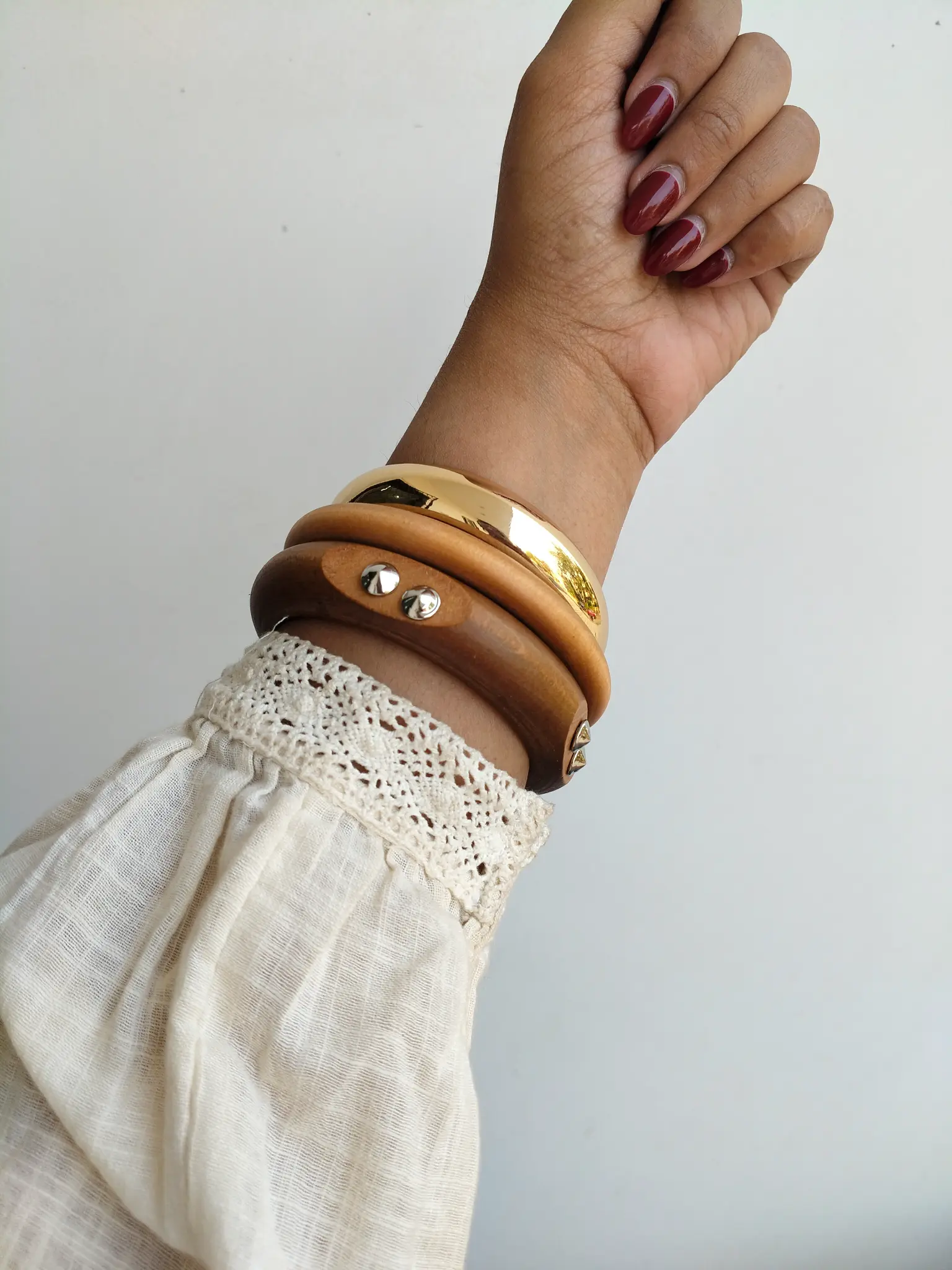 Introducing our Rustic Gold Muse Statement Stackable Bracelets — a bold yet refined trio designed for women who embrace effortless luxury. Featuring a high-gloss gold bangle, a smooth caramel-toned band, and a rich wooden bracelet accented with metallic studs, this stack blends natural warmth with contemporary glamour.